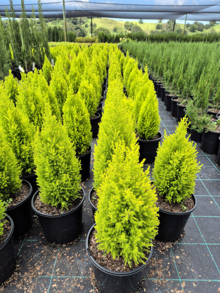 Lemon Scent Cypress (Cupressus macrocarpa) is a versatile evergreen that can reach 2-4 metres tall with a spread of 1-2 metres, making it perfect for hedges and privacy screens. Its golden to lime green foliage grows in a natural conical shape and releases a delightful citrus fragrance when touched. This hardy plant adapts well to various soil types and thrives in full sun to partial shade. Whether used for hedging, lining driveways, or as a feature in large pots, this low-maintenance cypress brings year-round structure and a refreshing sensory element to any garden.