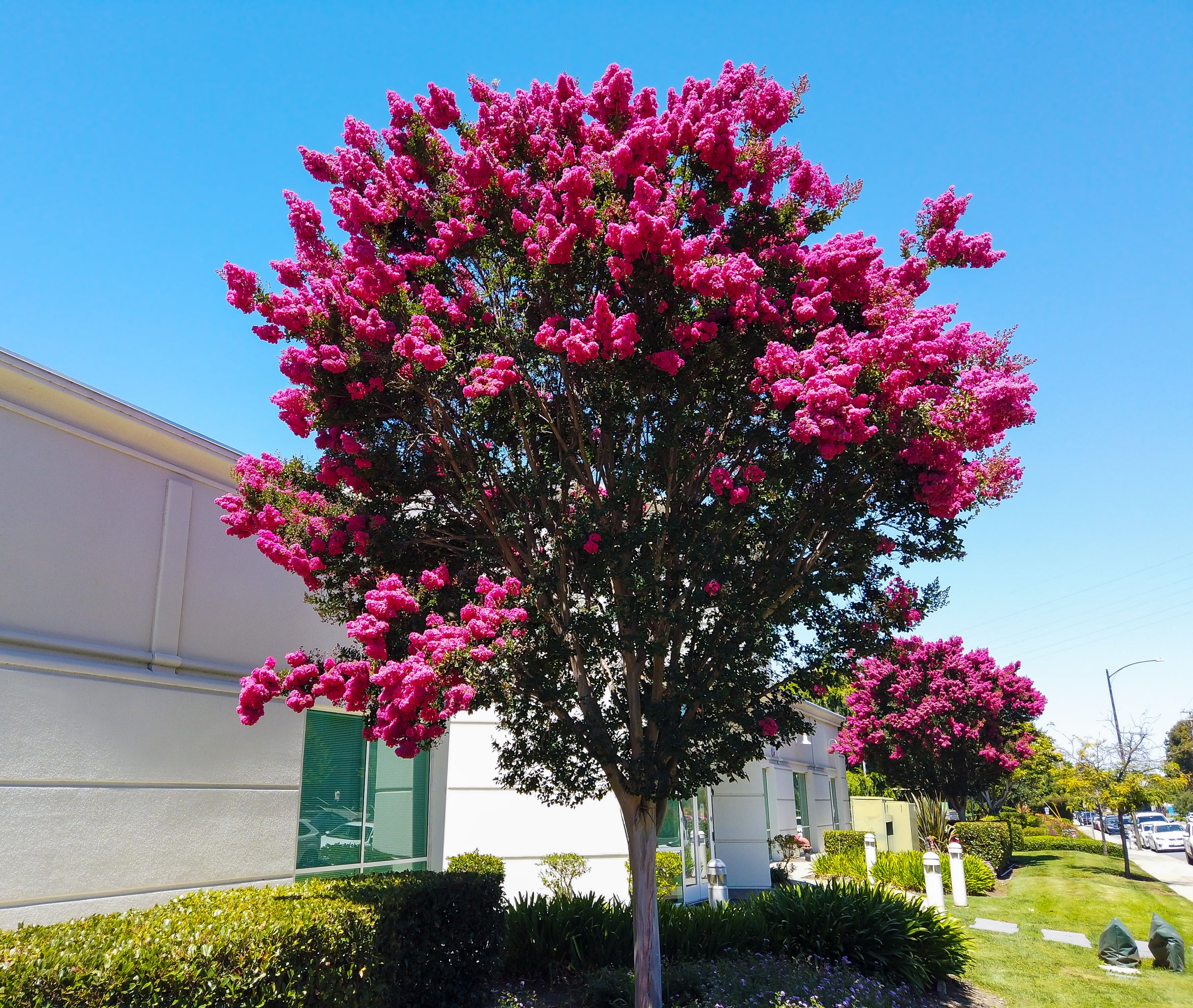 Forms a large shrub or small tree with multi-stemmed trunks, vibrant pink blooms during summer.
