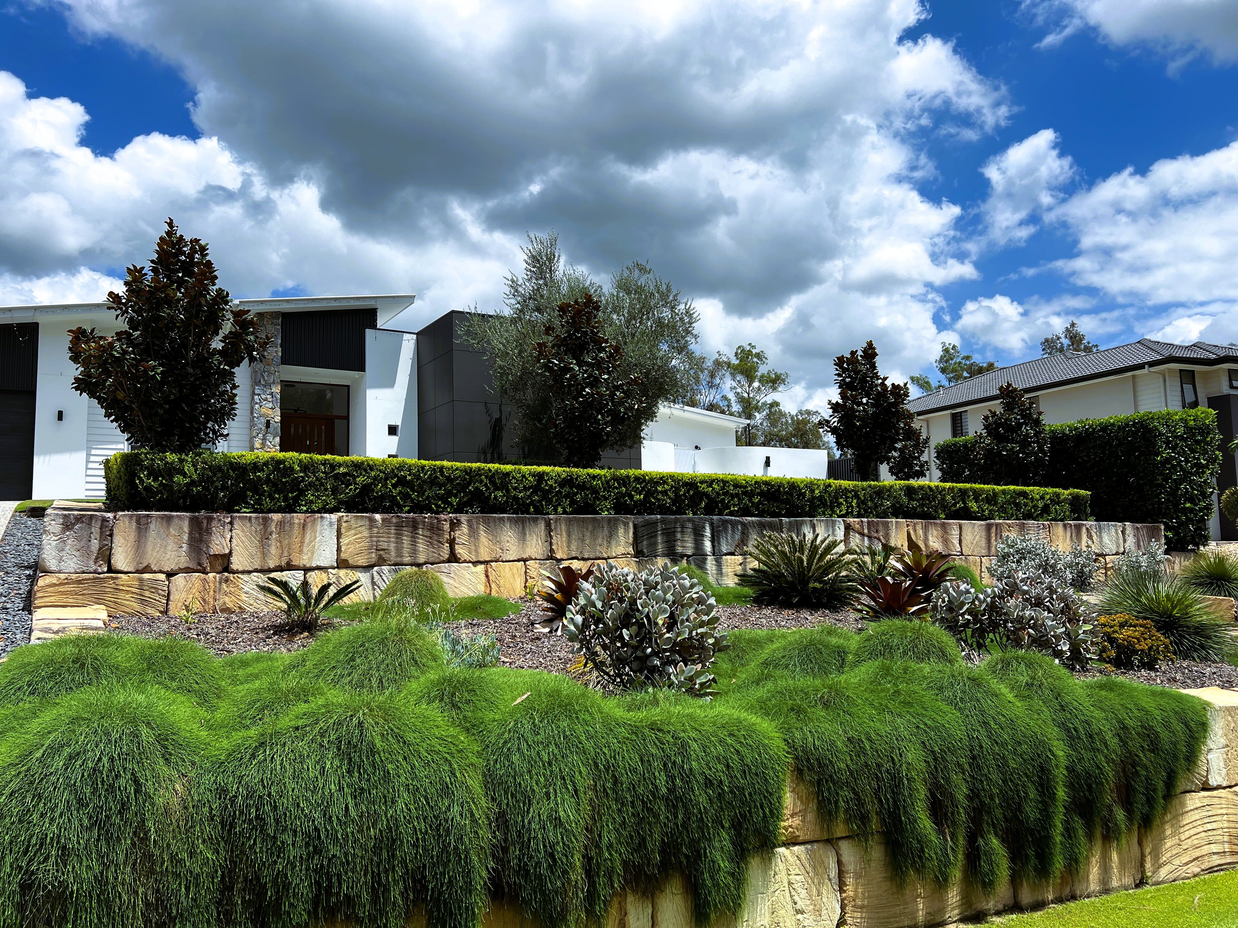 Cousin it's cover the front retaining wall, with a mix of Cyads and Bromeliads dotted in between.