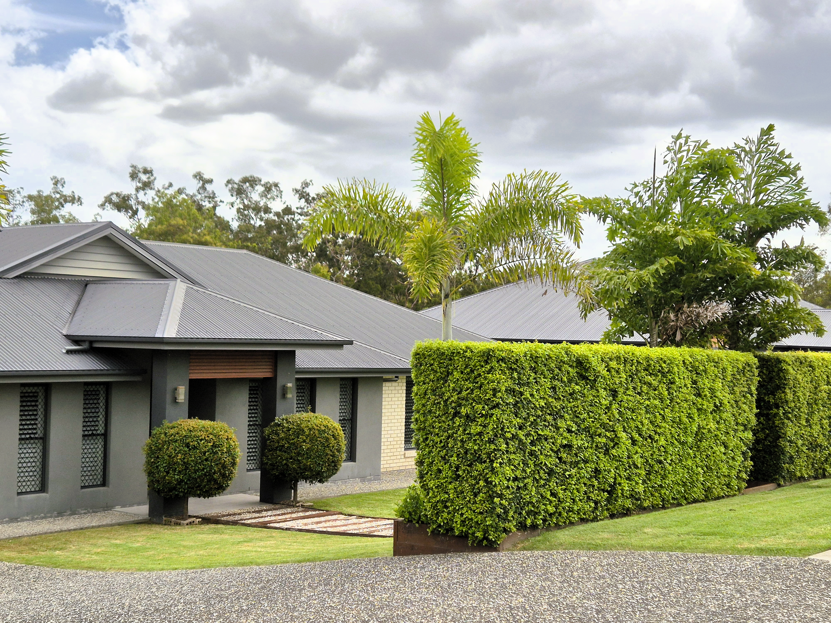 The front hedge has been pruned into a box shape, leaving it tall enough to create privacy by blocking out road noise. Mock Orange (Murraya paniculata) is a great choice.