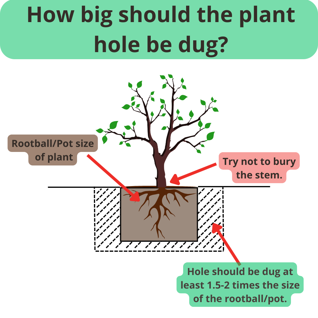 3. Holes should be dug no less than 1.5 times the size of the pot/root-ball. This gives the plant the best chance of growing as it will have lots of loose soil for the roots to grow in.