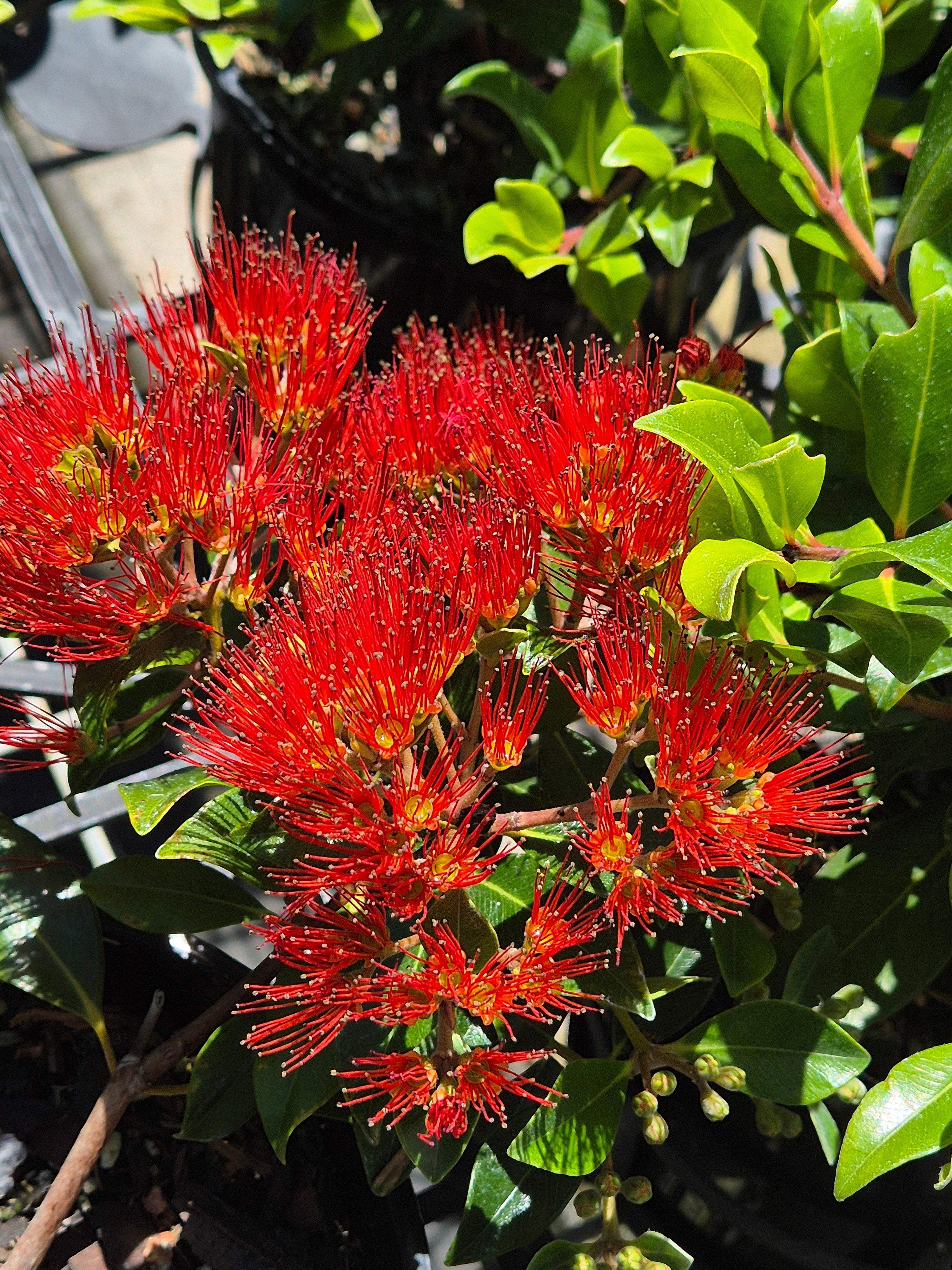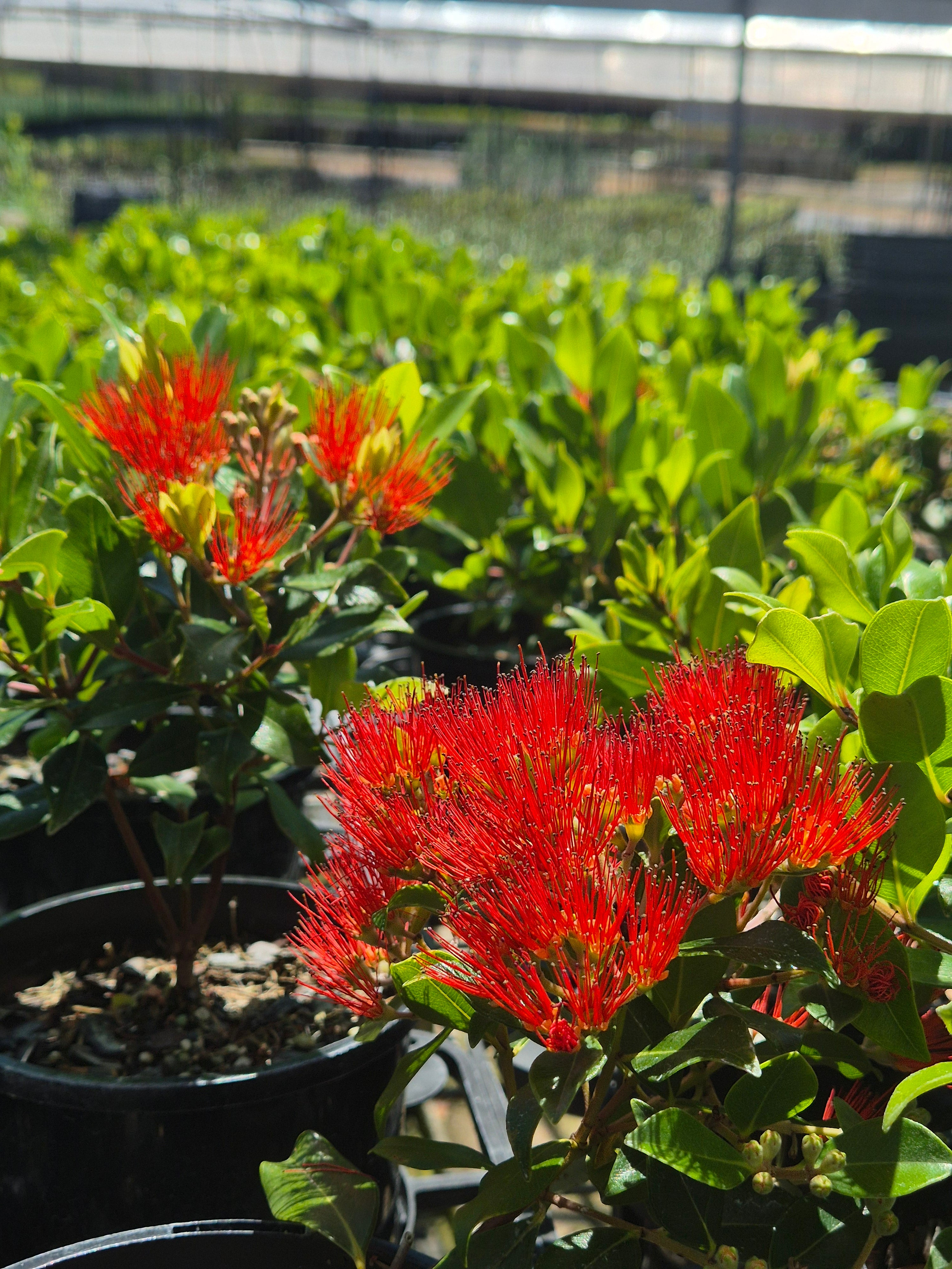 Compact shrub with glossy green leaves, vibrant red flowers in clusters. Metrosideros Little Dugald is renowned for its bright and vibrant flowers that add a burst of colour to any garden, making it a popular choice for those looking to attract wildlife and enhance landscape beauty.