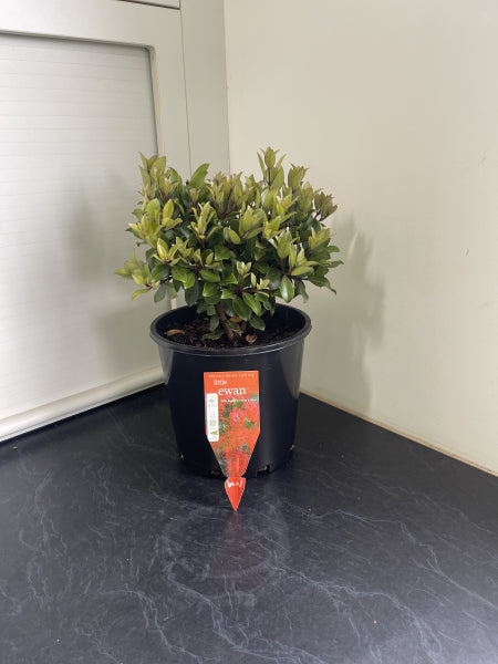 Little Ewan features dense green foliage, with new growth showcasing delightful coppery-red shades. This compact shrub thrives with showy, bright red flowers that attract birds, creating a vibrant spectacle throughout your garden.